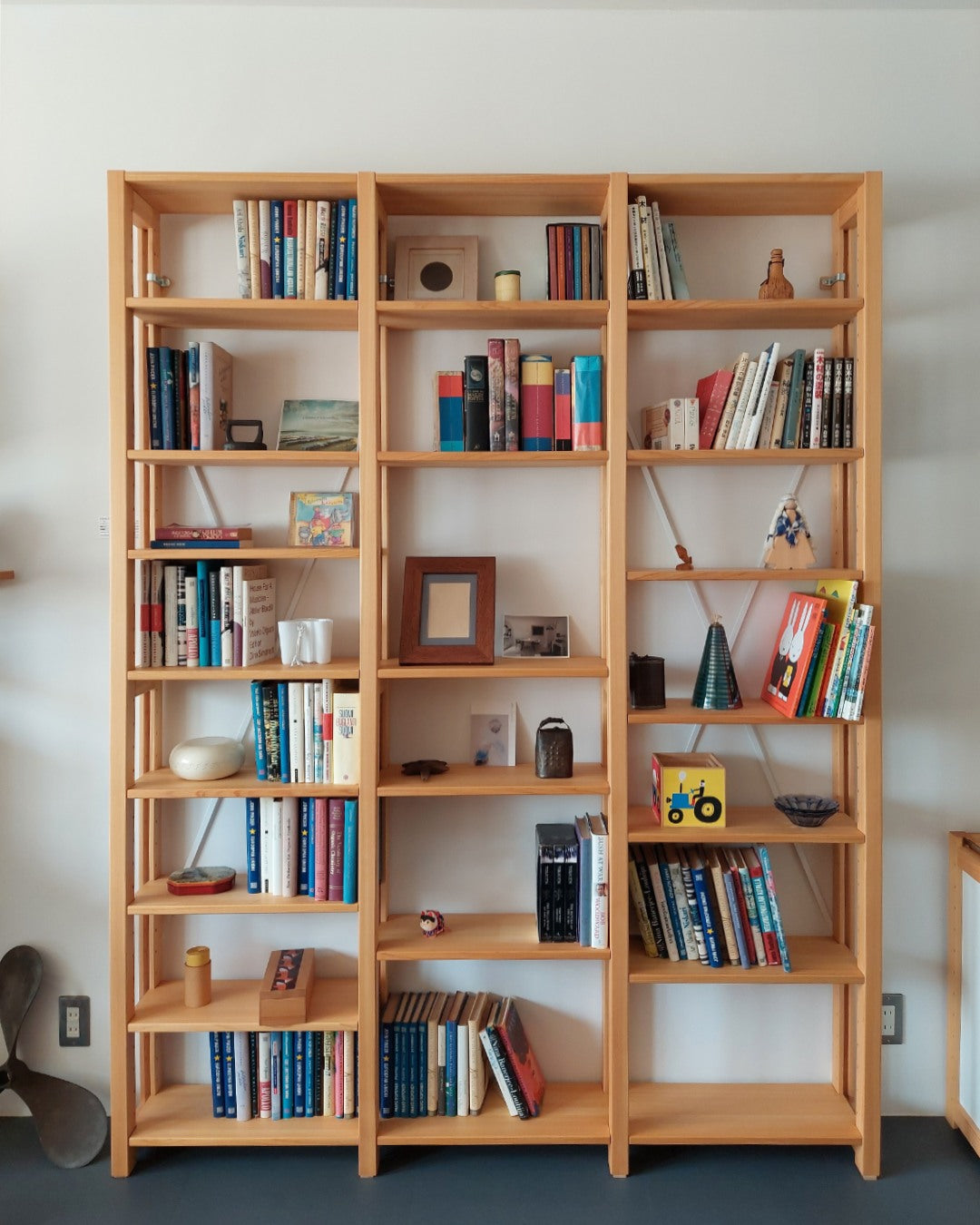 開封の段階から、いいものを買えたなという感を覚えました 開梱の段階から、いいものを買えたなという感を覚えました。まずは小さい方、次いで階段下本棚をこしらえました。棚板を増やしていくときに入りにくいところが一部ありましたが、あの大きさと重さの割には簡単に順調に組み上がりました。簡単に組めたのにがっしりした感じで、妻も大喜びでした。早速、本をどしどし収めました。