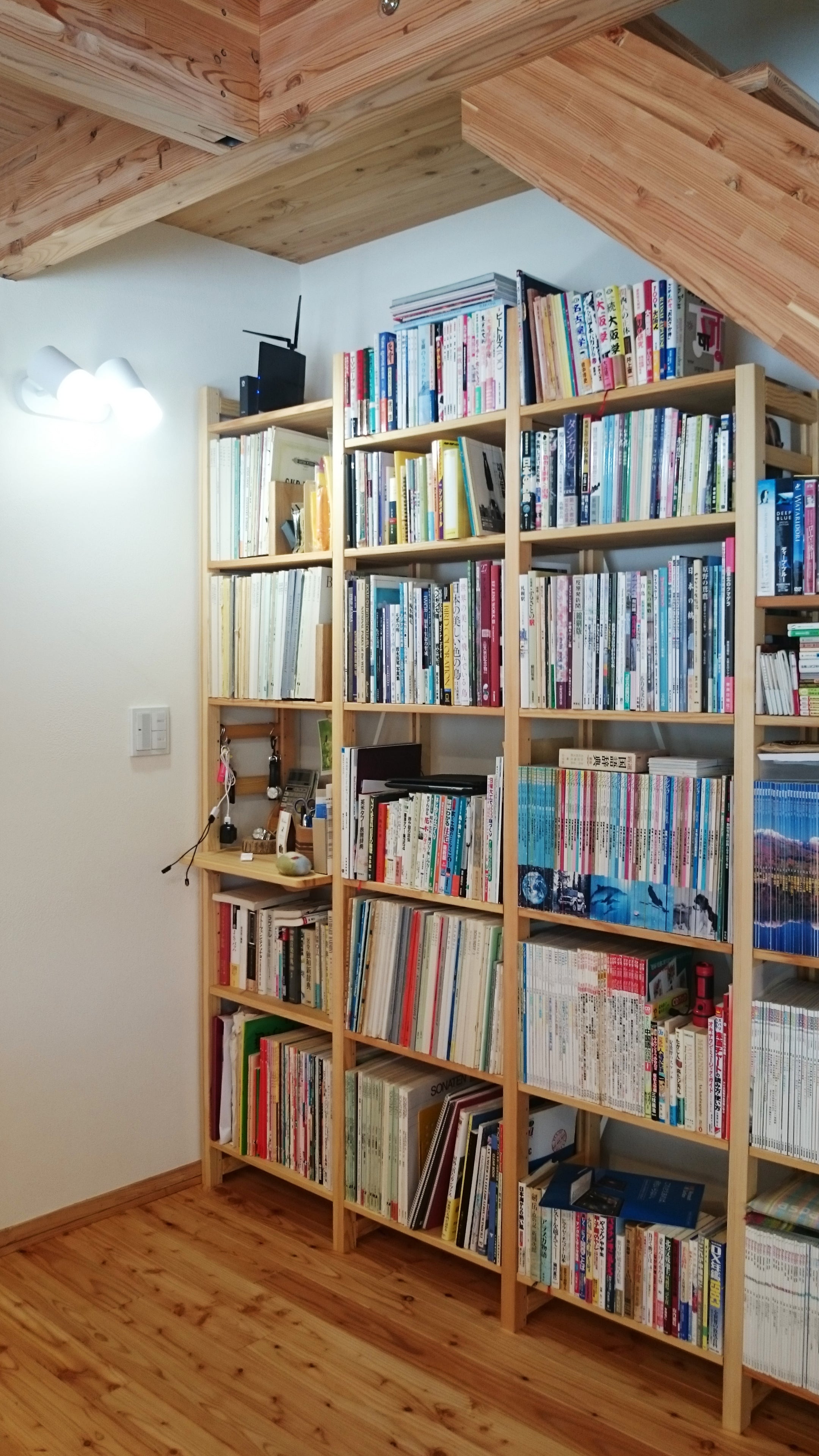 木の香りがする棚に位置を考えながら本を並べて楽しんでいます。